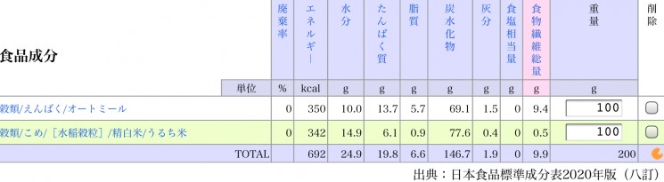 オートミールと白米の食品成分を比較してみました。