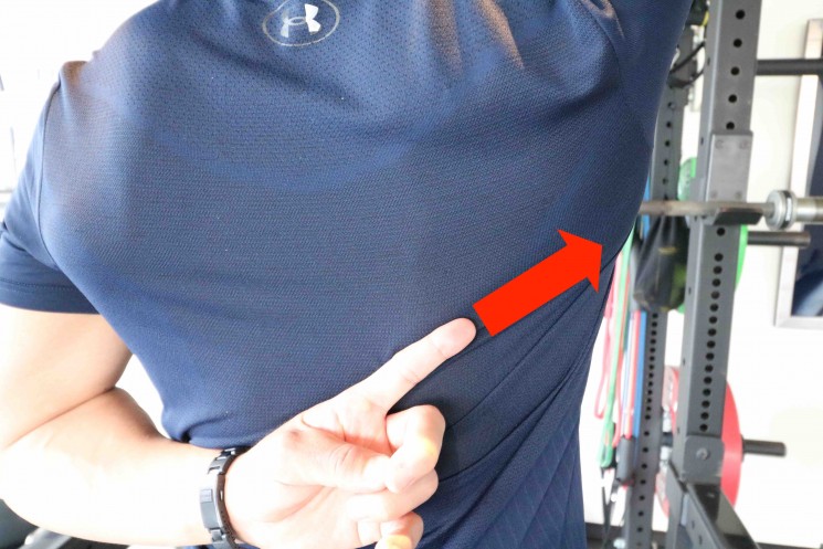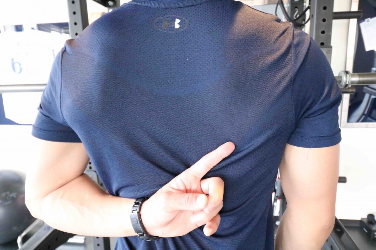 左手を背中に回し、そのまま右の肩甲骨の下端を触ってみましょう。