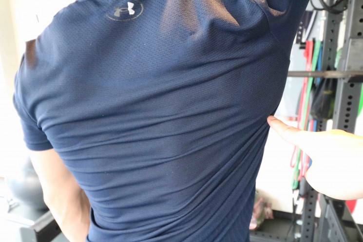 触ったまま、右手を万歳します。すると触っていたはずの肩甲骨が無くなるのが分かると思います。
